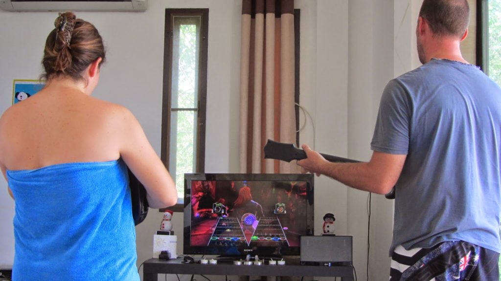 Simon was a busy bee, on his computer advertising my old laptop and video camera with underwater housing ..and then brought out the Guitar Hero equipment which had been sat collecting dust under the stairs to see if everything worked. The drum set was in need of a little soldering and glueing but that was about it..
