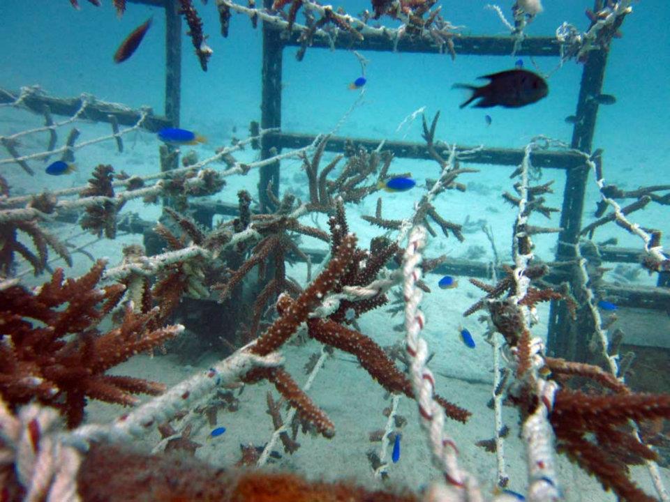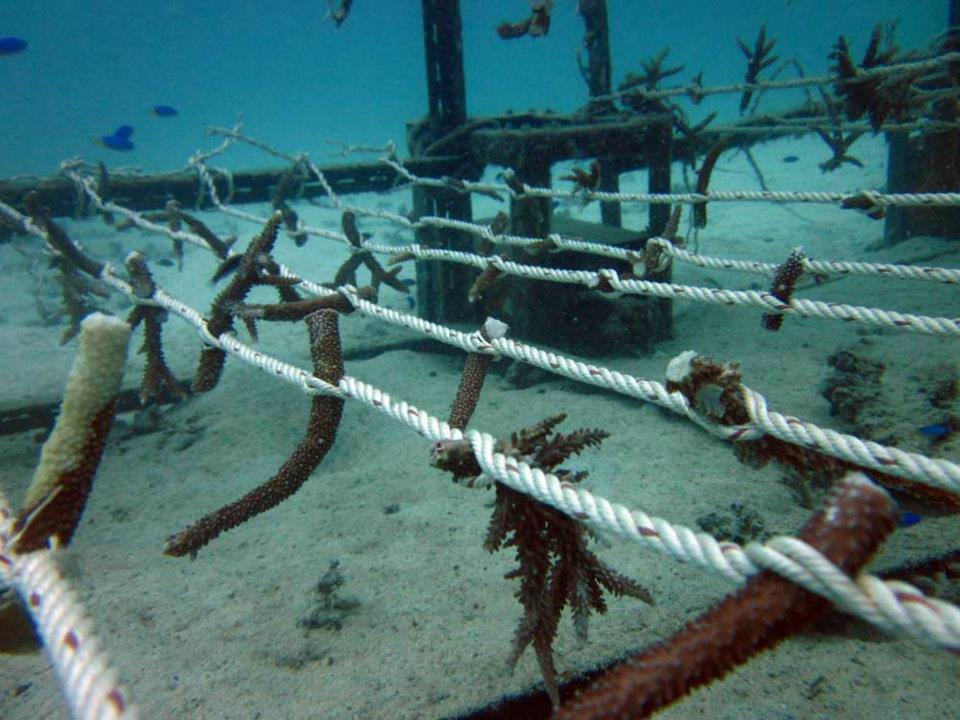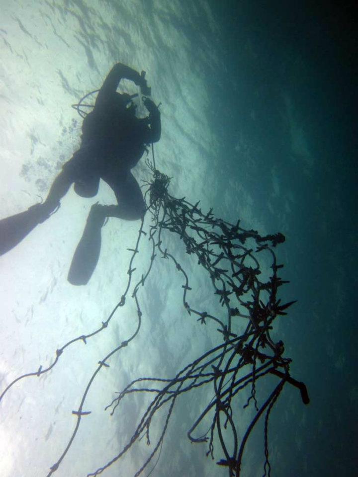 To keep the stress levels lower, once a tray, or ropes have been populated, we tie them to the boat, and let them hang in the water until we are ready to dive. When we were nearly done, I went to the back of the boat, and all our transplants were missing. The knot that tied them all to the boat was worked loose I guess… and they had all sunk without us noticing…