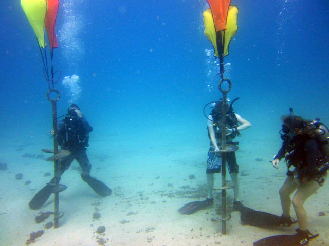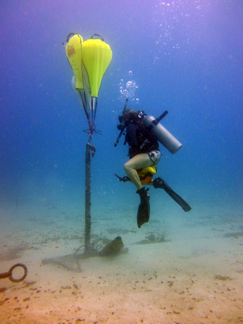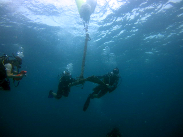 Jen and I swam the path of the anchor and met the other guys, where we used lots of lift bags to raise the sandscrew and anchor to return them to Junkyard… It was a tough task and we have to return to move the concrete slabs tomorrow, but a lot got done.