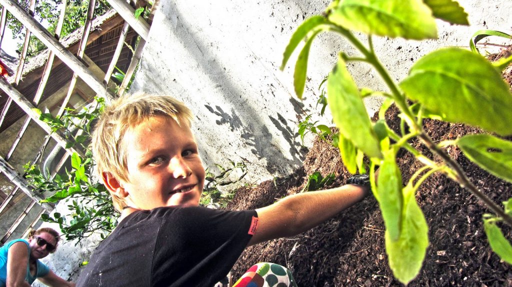 Using layers of cardboard, brown leaves, greenery etc, to make up different layers of Carbon and Nitrogen we built it up over a couple of hours before placing compost on top and planting a range of veggies.