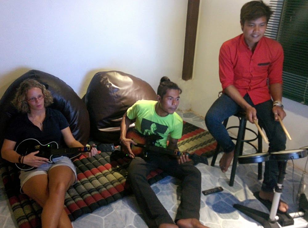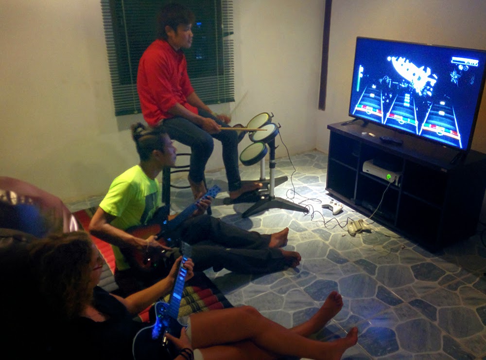 The night before Linda left, we had a small BBQ and Jenny invited the bar boys.. They came around at about 10pm, and we made them some food and got the Rock Band kit out…