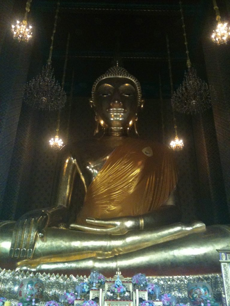 8.20am and after Si and I checked map last night, the boat ride said 15 mins ..I was going to be sooo late. Stressed and texting Si, the boat stopped, passengers boarded and we were off again. Glancing up, I saw ‘Si Phraya Pier’ ..I’d missed my stop AGHHH!!!!!! Luckily the next stop was pretty close and I raced off the boat making my way back to their office which was very easy to find ..once there I signed in, was given a bike and a guide led me to the group who had stopped at a temple just up the road. So had not missed too much.