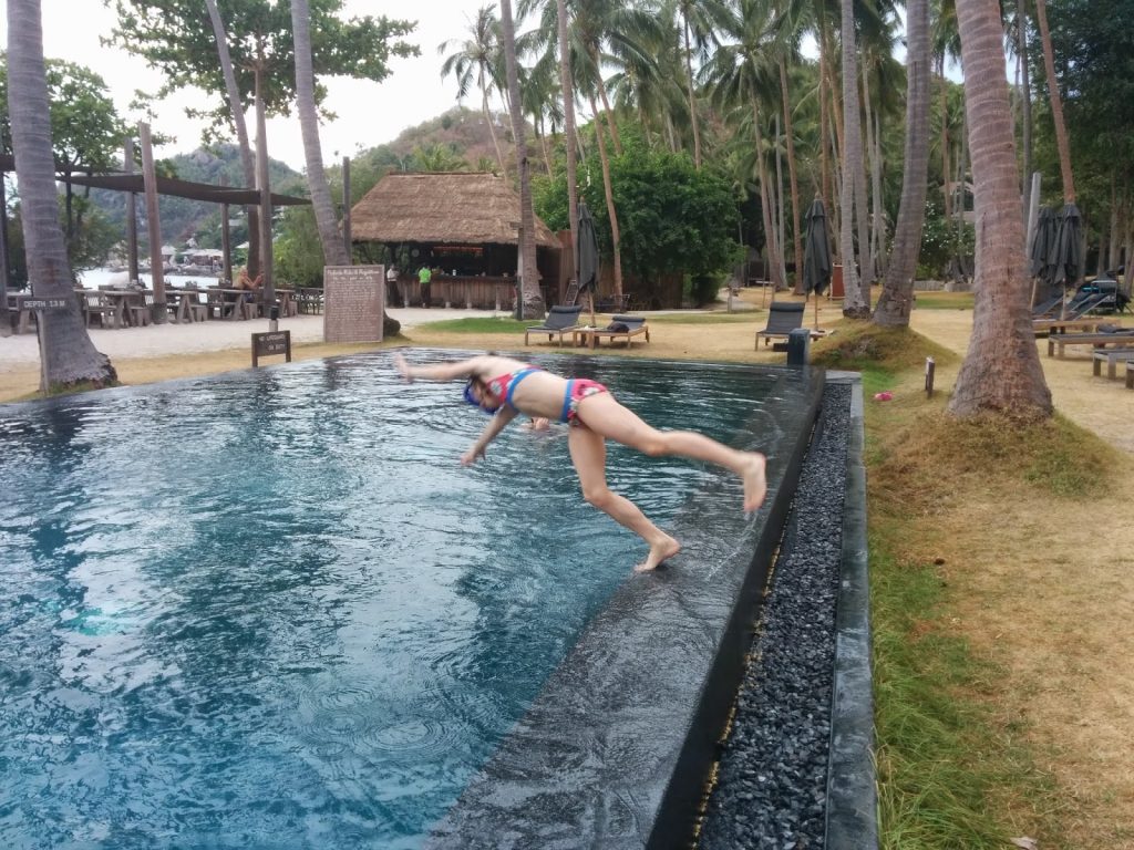 After walking around, I finally found them at the poolside with the kids already jumping around in the pool.