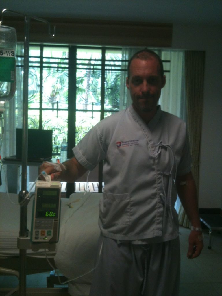 The journey took about 3 hours, standard ferry trip and then ambulance from the port to the Bangkok Samui hospital. Once into the ER room, I had a gaggle of nurses poking and prodding, taking blood adding a new IV line (missing twice)… and then a ton of documents to sign to acknowledge all costs (so far about £2,000 !).