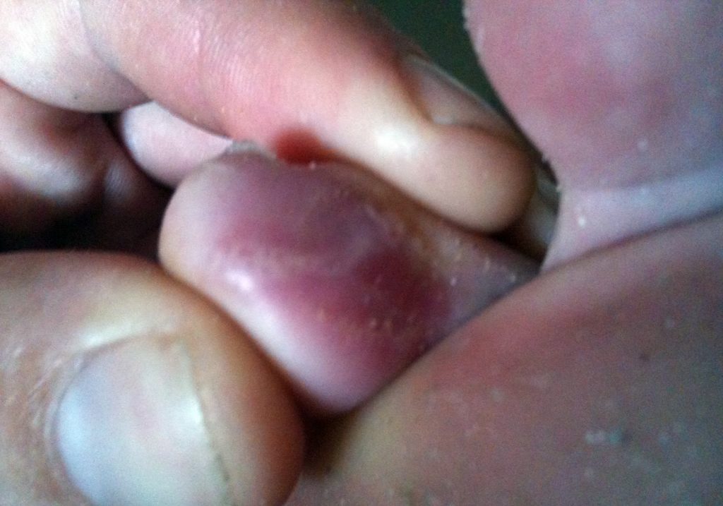 It turns out that my toe is currently a home for a worm! If you look at the photo below you can see the route that the little bugger has travelled. I must have picked up the worm by walking through a puddle with some bacteria in it.