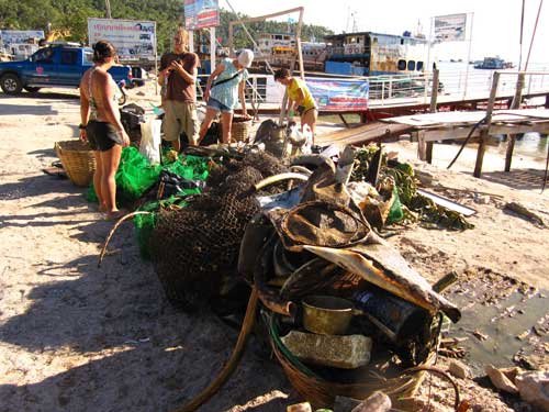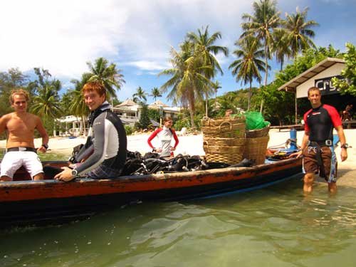 It didnt take that long to fill our bags, we’d found nets, plastic bags, sacks, piping, drink cans and clothes to name a few. The longtail was coasting about, so on surfacing, we’d call it over and empty out the contents and then carry on collecting.