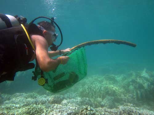 Back on land, everyone gathered, dive kits assembled and after a briefing by Nathan we headed out equipped with rubbish bags (nets) and scissors. Some got dropped off from the longtail whist some of us just swam out.