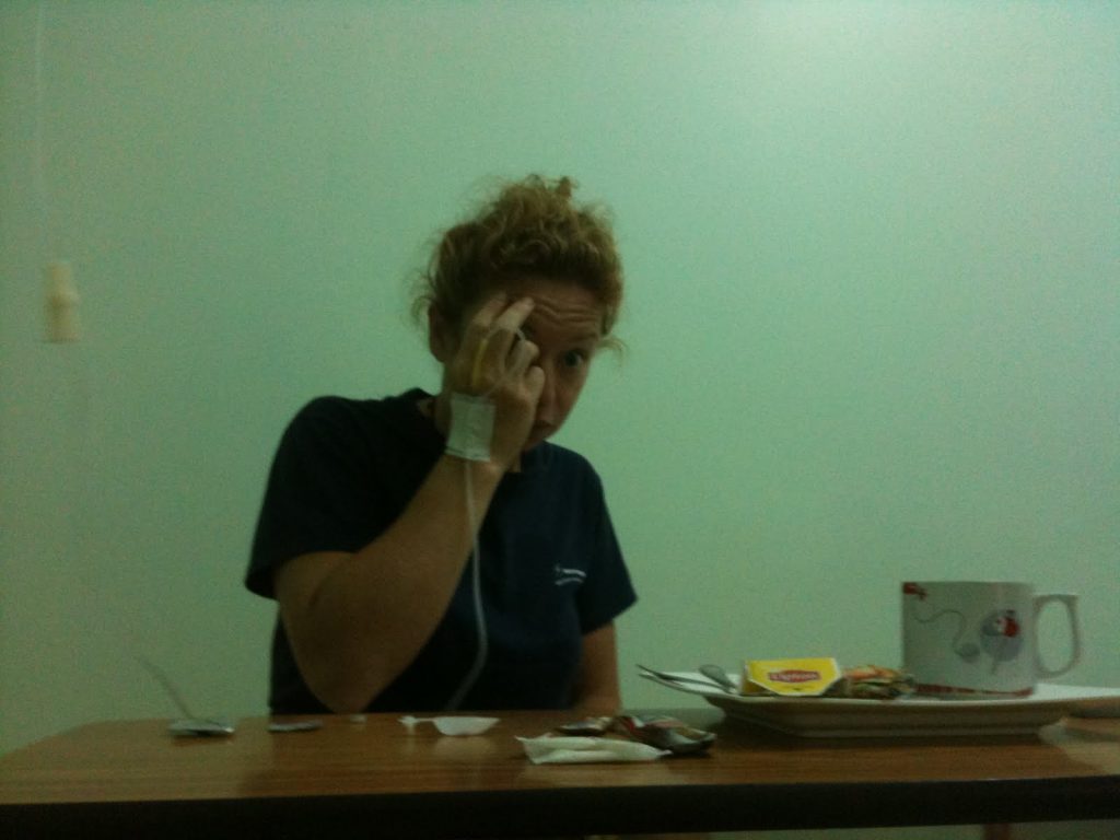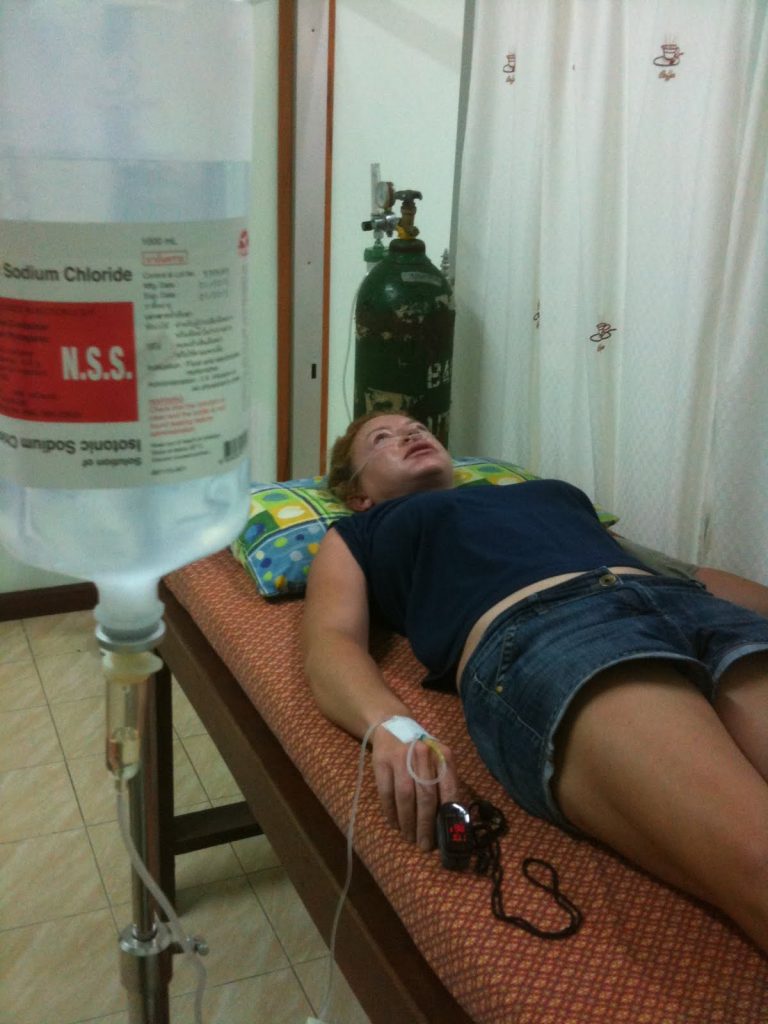 Another 10 minutes passed by, and we arrived at the clinic, where Jen was taken straight in and put on a drip and monitor. Her oxygen levels were lower than normal (probably due to not being able to breathe properly). Her blood pressure was way high.