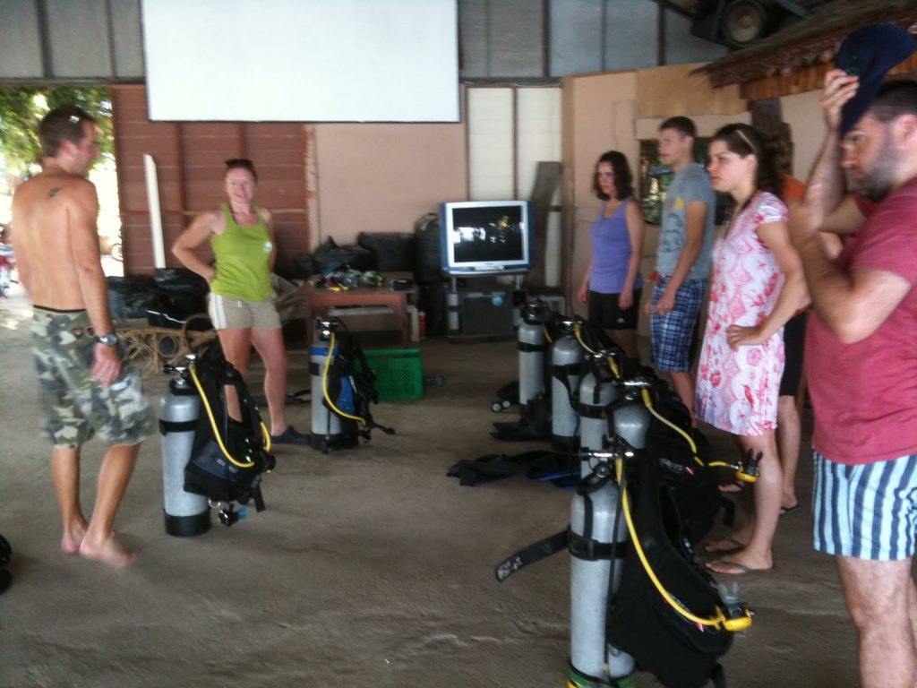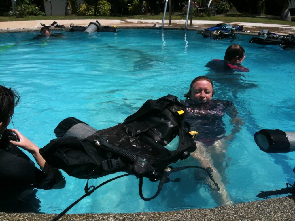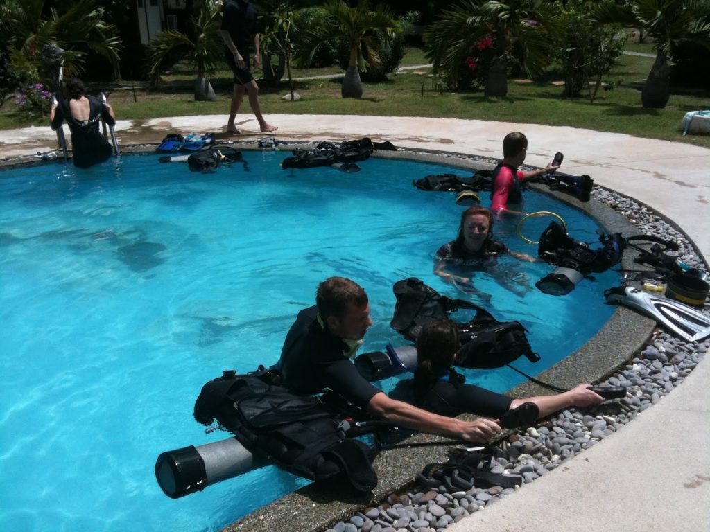 After setting up the students with equipment (Fins, wetsuit, BCD & Tanks) we headed to the bar area and Iain demonstrated how to set up their equipment as they copied then they had to do this another 4 times on their own. ..after this was mastered we headed for the pool for their underwater skills.