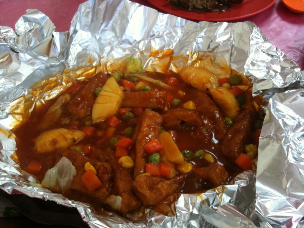 As we had hardly eaten since yesterday, we started to feel full after the spring rolls and made a pathetic dent in the rest of the food. So instead of wasting it, we got it takeaway.