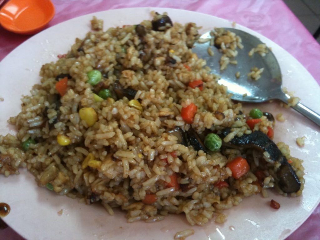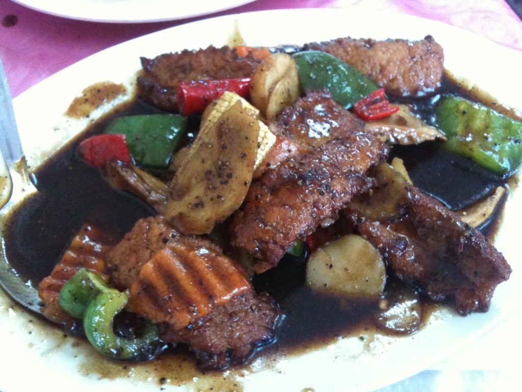 Vegetable spring rolls, Beef (fake) strips in black bean sauce, BBQ’d chicken (fake) with vegetables and lastly, fried rice.