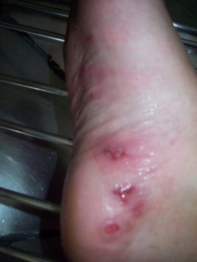 Well the good news is, that its got much better, here is a photo from after the dressing was removed yesterday… infection gone!!! Yippee… Now scrape daily and wait to heal.