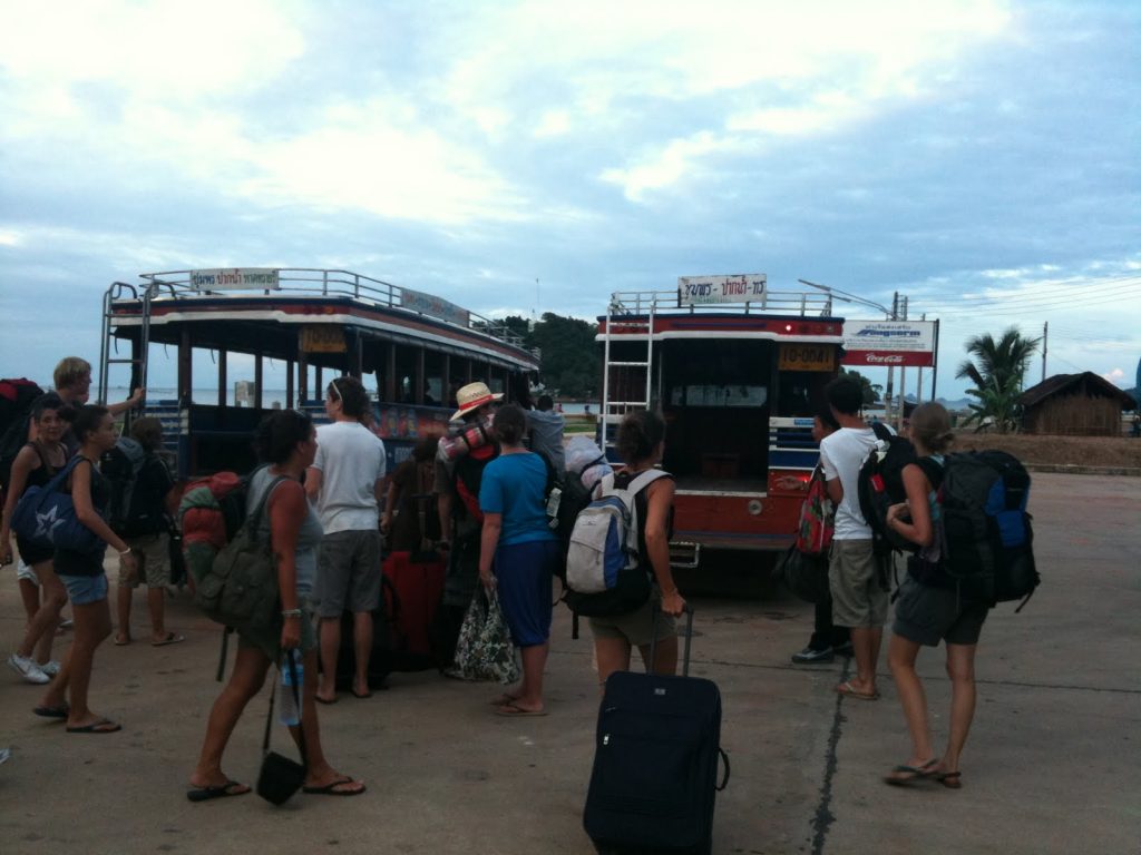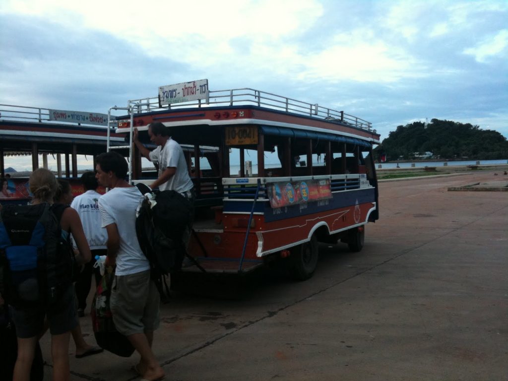 At Chumphon, we had a 40 minute wait until two little buses came. Luggage was thrown on to the roof whilst everyone piled in.
